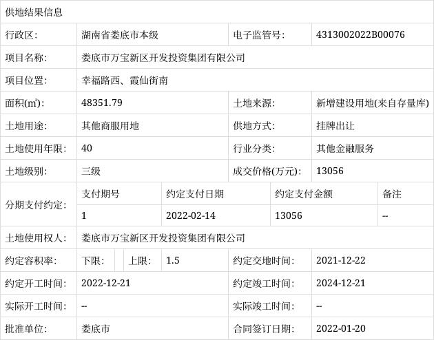 掛牌出讓供地結(jié)果信息(婁底市萬(wàn)寶新區(qū)開發(fā)投資集團(tuán)有限公司-幸福路西、霞仙街南)